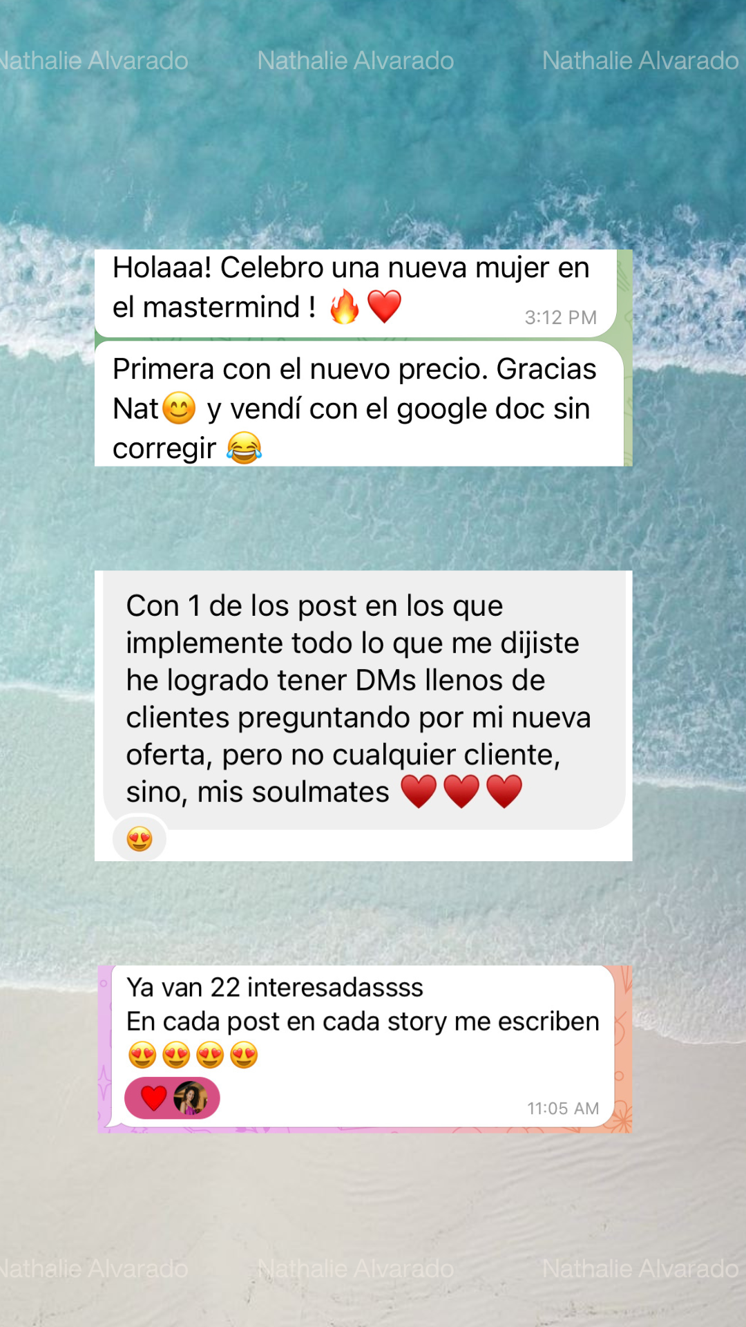 "Estoy subiendo unas historias hablando sobre diferenciación e identifiqué mega rápido la parte en la que me fui por unos segundos a hablarle a mi clienta anterior. Ya lo borré. Gracias por todo el aprendizaje, estoy teniendo una CLARIDAD tan exacta para hablarle a mi mejor clienta que es como wow. Esto sin dudas es algo que no sabía y que nadie más había podido enseñarmelo tan rápido y sencillo. Quiero que seas mi mentora forever ❤️"