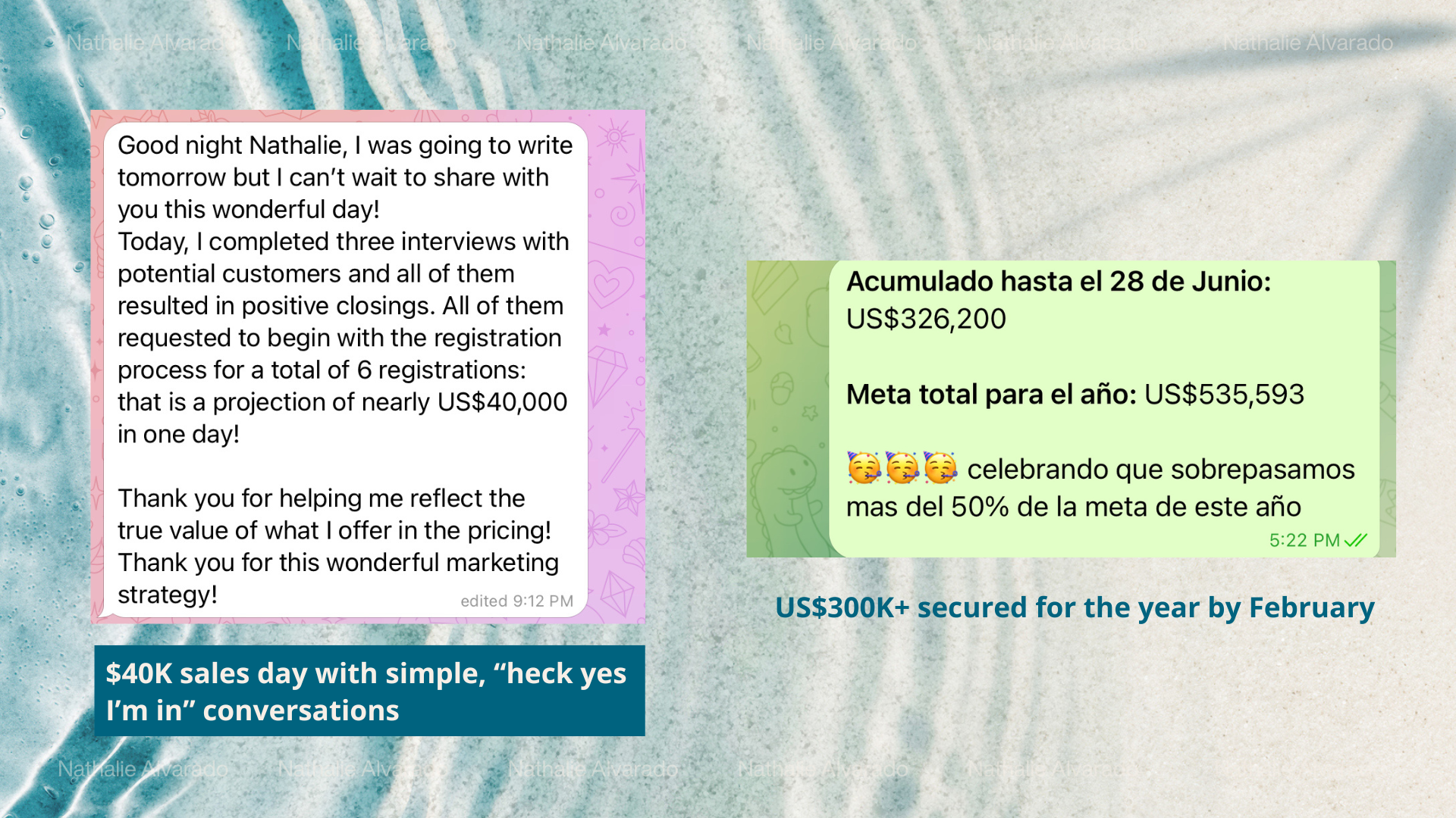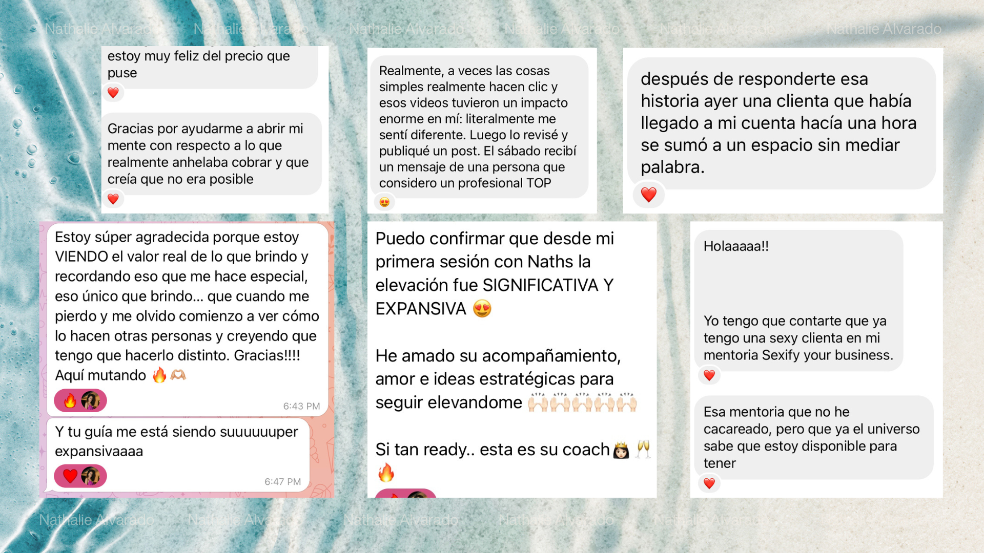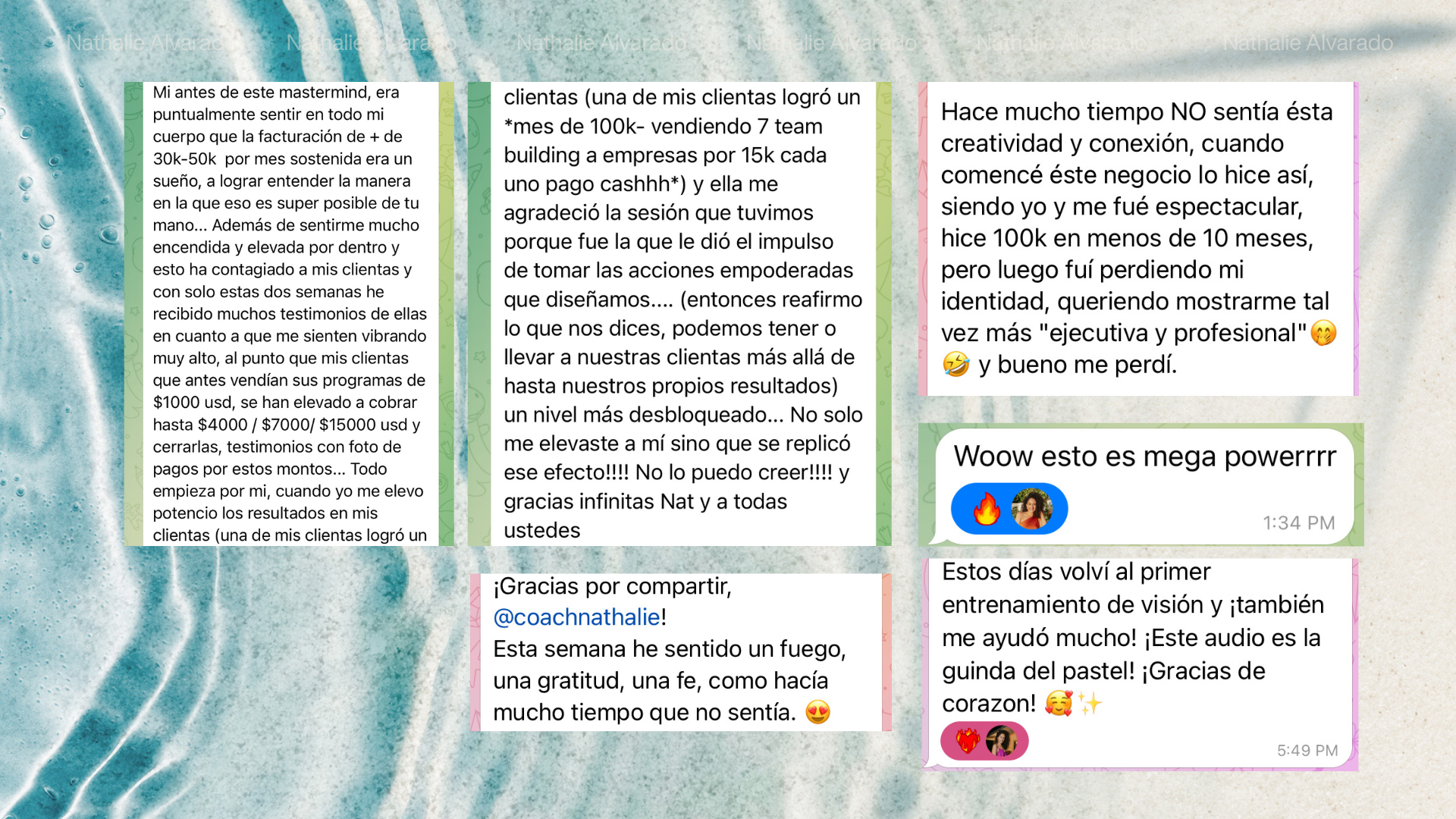 (3) Sesiones Mastermind en vivo con Nathalie para potenciar al máximo tu capacidad de innovación e intención: claridad en tus mensaje para atraer un cliente más avanzado y planificación estratégica para que generar más de $500,000 anuales sea tu normal mínimo absoluto