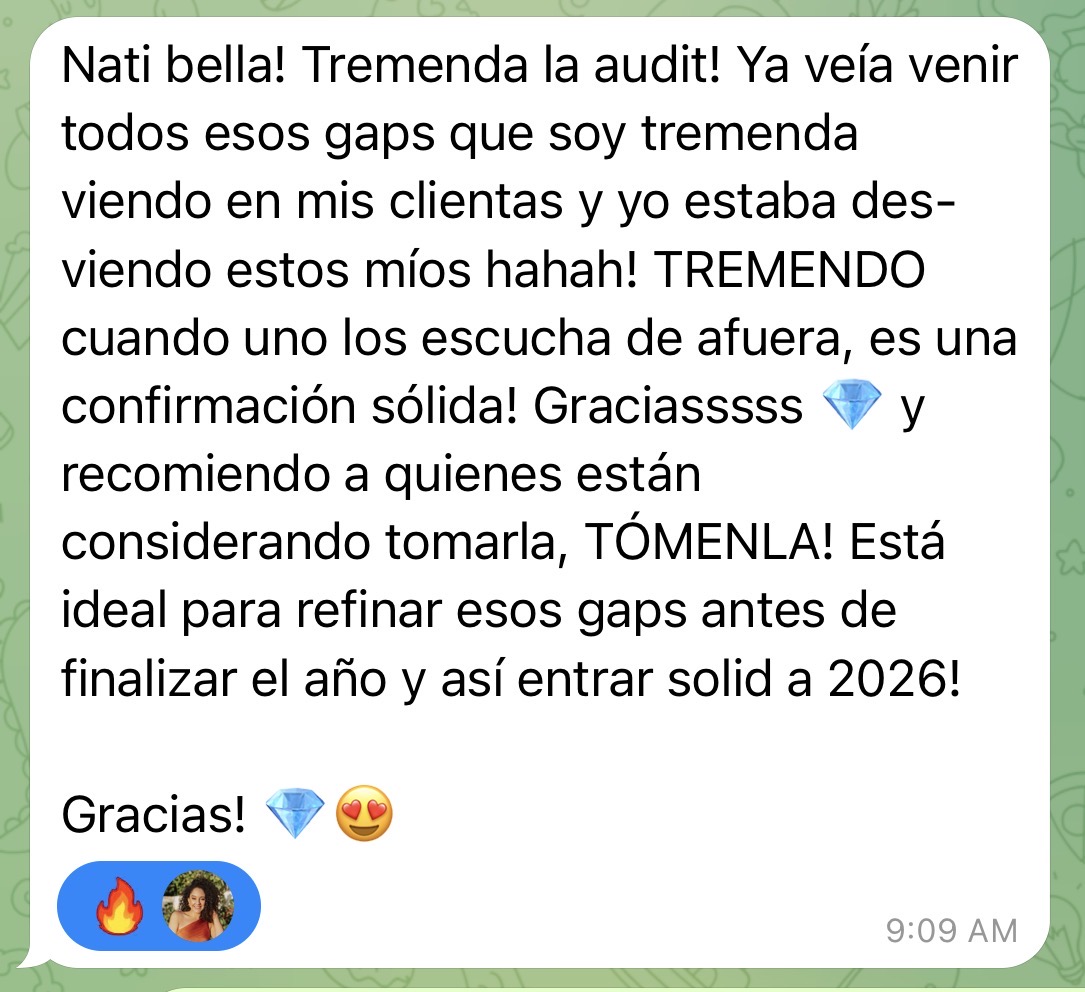 Esta auditoría no incluye acompañamiento adicional. Envíame un DM a @coachnathaliealvarado y pregunta por mi acompañamiento 1:1.